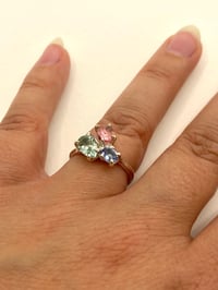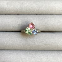 Stunning one of a kind silver ring with three complimentary pastel colour gemstones; Pink Tourmaline, Blue Sapphire and Green Peridot.